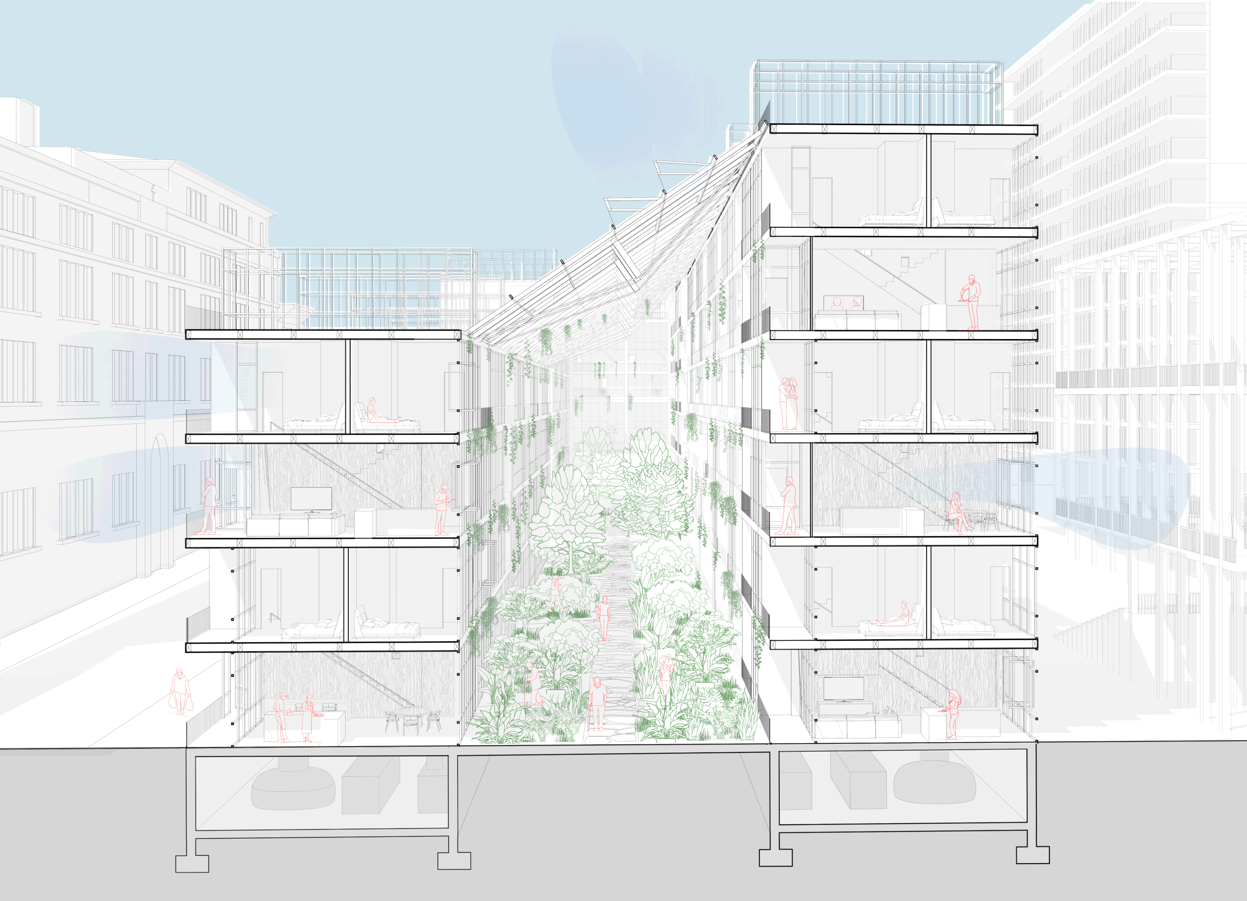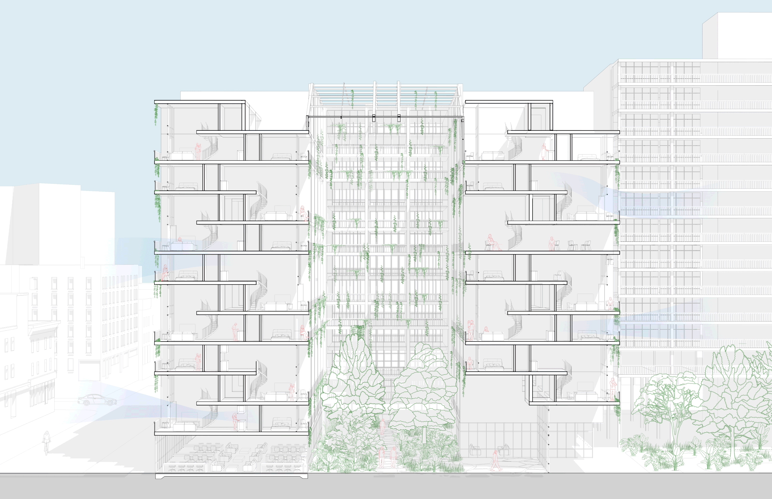 A reconsideration of the limited understanding of comfort is needed. Thermal Autonomy challenges the static notion of comfort, and gives authority to the residents to control their microclimate. Our site strategy focuses on creating an environment which establishes comfort by utilizing the breezeway to respond to the climate of our site with a particular focus on sun, light, and wind. Voids and negative spaces are used as public space which, while serving both programmatic and functional purposes, also serve as the main component used to establish comfort. We are thinking about air as a tool which can be leveraged to sustainably provide comfort, providing both a means for heating when confined and natural ventilation when allowed to flow freely.